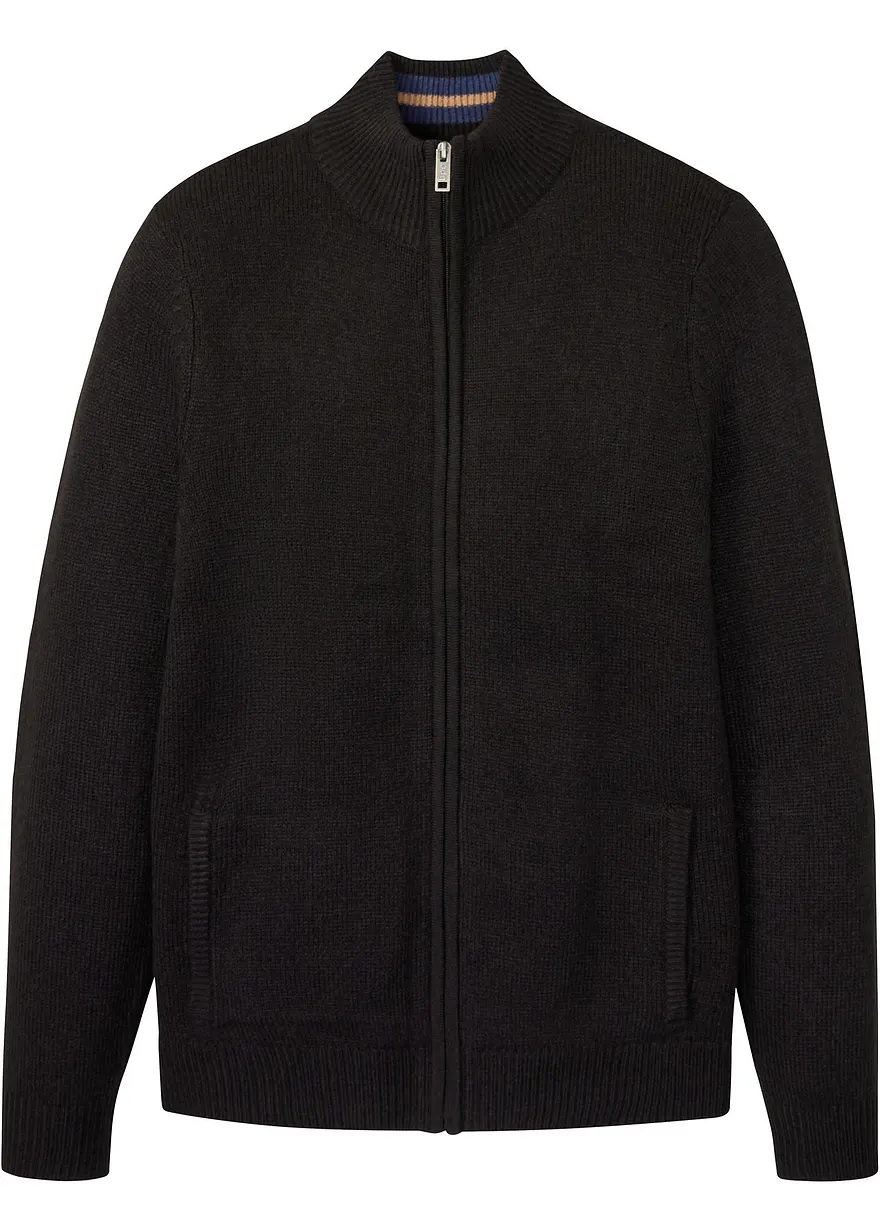 Strickjacke mit Stehkragen und Reißverschluss in der vorderen Mitte.