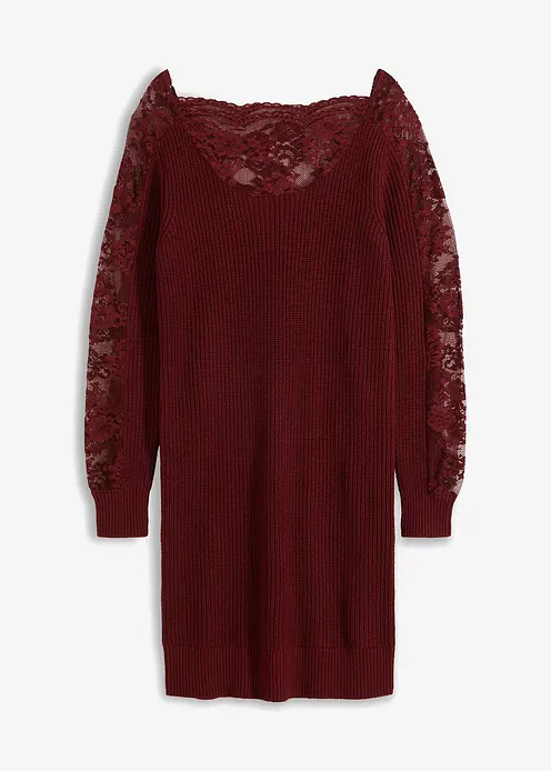 Modernes Strickkleid mit Spitzeneinsatz. Länge in Größe 36/38 ca. 90 cm.