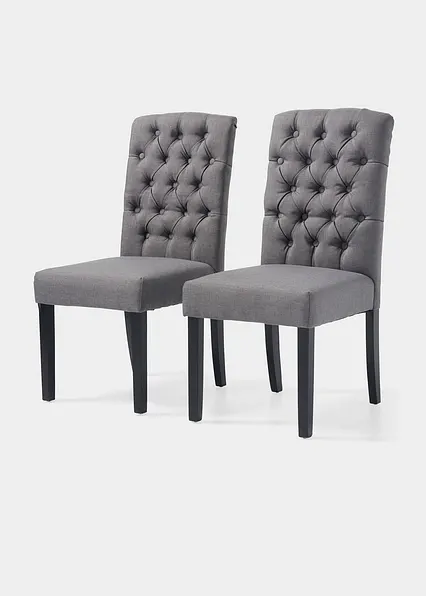Bequem gepolsterte Stühle im 2er-Set mit Bezug aus Polyester. Besonders schön ist die Knopfsteppung in der Rückenlehne. Lieferung erfolgt teilmontiert, nur die Beine müssen noch angebracht werden
