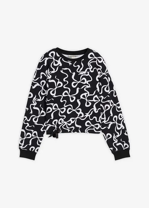 Dieses trendige Sweatshirt aus reiner Bio-Baumwolle ist perfekt für einen lässigen Look! Mit einem runden Halsausschnitt und langen, eingesetzten Ärmeln bietet es eine bequeme Passform und endet in einer kurzen Länge.Der gerade Saum verfügt über einen Tunnel mit einem fixierten, schwarzen Satinband, das seitlich in einer Schleife gebunden werden kann. Die Verarbeitung sorgt dafür, dass das Band sicher und kinderfreundlich ist. Ideal für den Alltag oder besondere Anlässe – einfach anziehen und wohlfühlen!