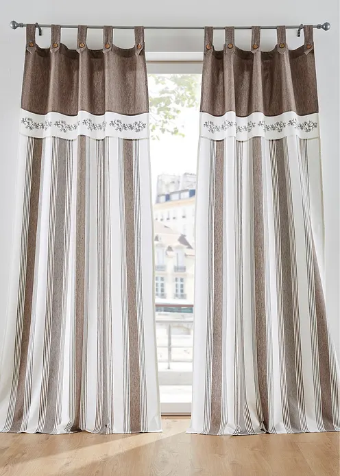 Vorhang aus Bio-Baumwolle im Landhausstil, mit gedruckter Bordüre und gewebten Streifen.