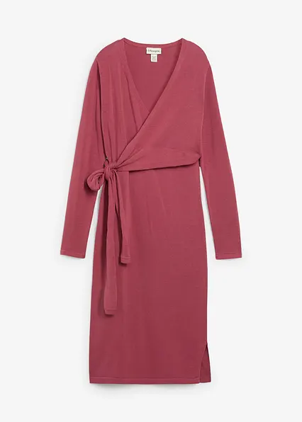 Mittellanges Strickkleid aus reiner, atmungsaktiver Bio-Baumwolle mit V-Ausschnitt. Bindebänder ermöglichen die individuelle Weitenregulierung, sorgen für eine schmeichelnde Silhouette und machen das Kleid auch nach der Schwangerschaft tragbar. Der Schnitt erlaubt einfaches Stillen sowie bequemes An- und Ausziehen. Extra lange Ärmel und kleine Seitenschlitze am Saum runden das Design ab.